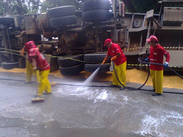 | Bombeiros limpam óleo diesel que ficou na rua. |