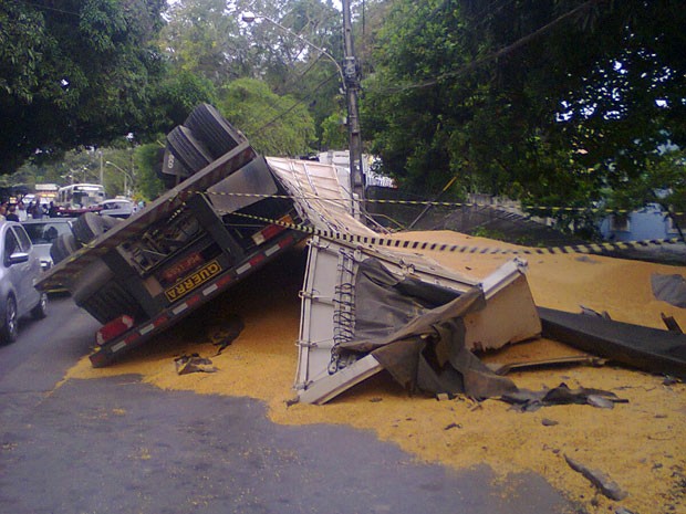 Uma carreta carregada de milho tombou na Rua Dom Manoel de Medeiros, no bairro de Dois Irmãos, na Zona Oeste do Recife, na tarde desta segunda-feira (26). O teste do bafômetro acusou que o motorista de 36 anos estava alcoolizado. Ele foi autuado em flagrante por embriaguez ao volante na Delegacia da Macaxeira.